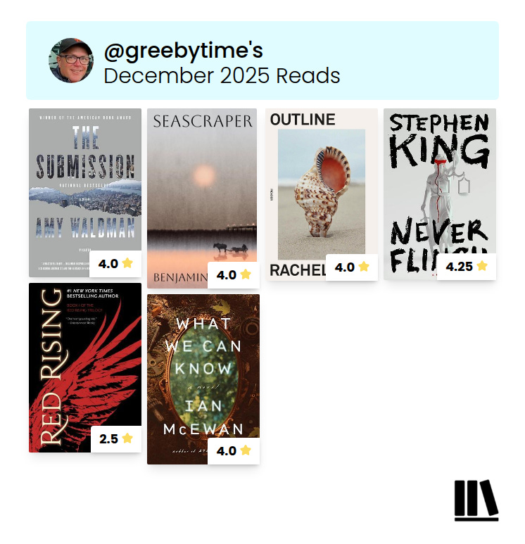 One thing I did in December was to look through my Kindle and try to start reading books I bought (or got otherwise) long enough ago that they never show up when I’m scrolling in the device to look for a new read. That led me to reading both The Submission by Amy Waldman and Outline by Rachel Cusk. Both were 4-star reads for me, and I’m hoping to continue to clear out these books and make my digital library a bit more manageable.