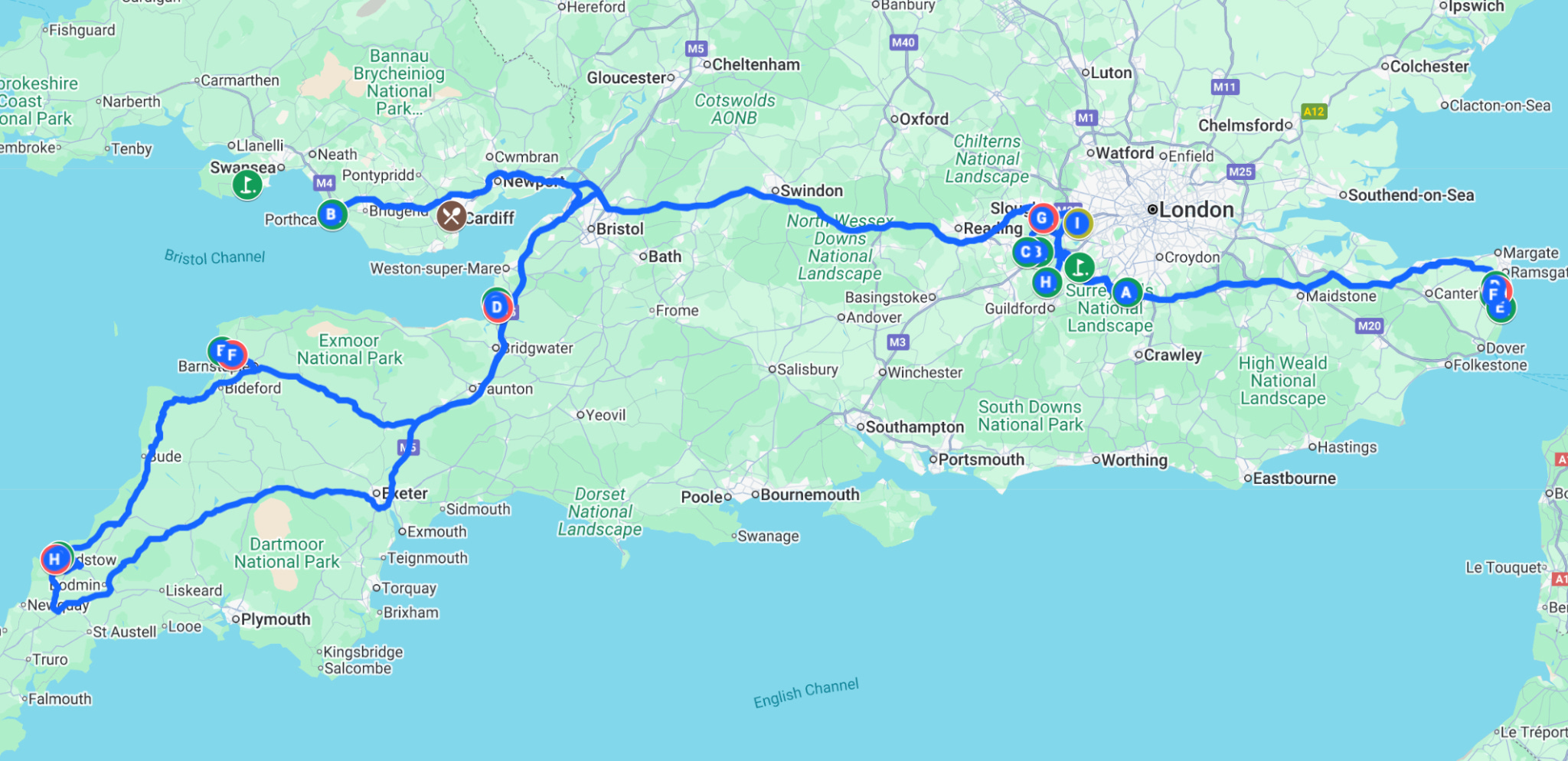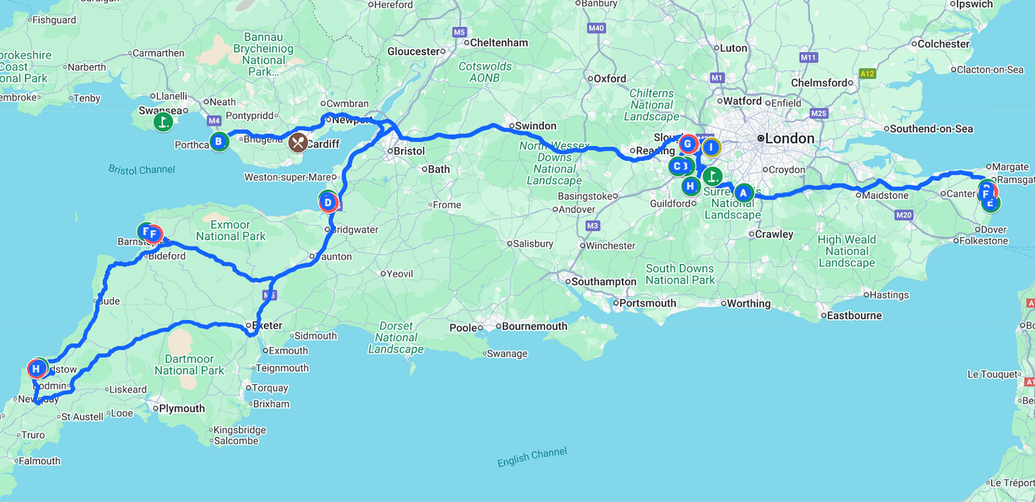 My man David and I will fly into Heathrow, arriving early Sunday morning. In an act of shocking self-restraint, we are NOT playing golf that day, and instead will make our way to Wales where we will meet up with AC. Then, the itinerary follows as such.